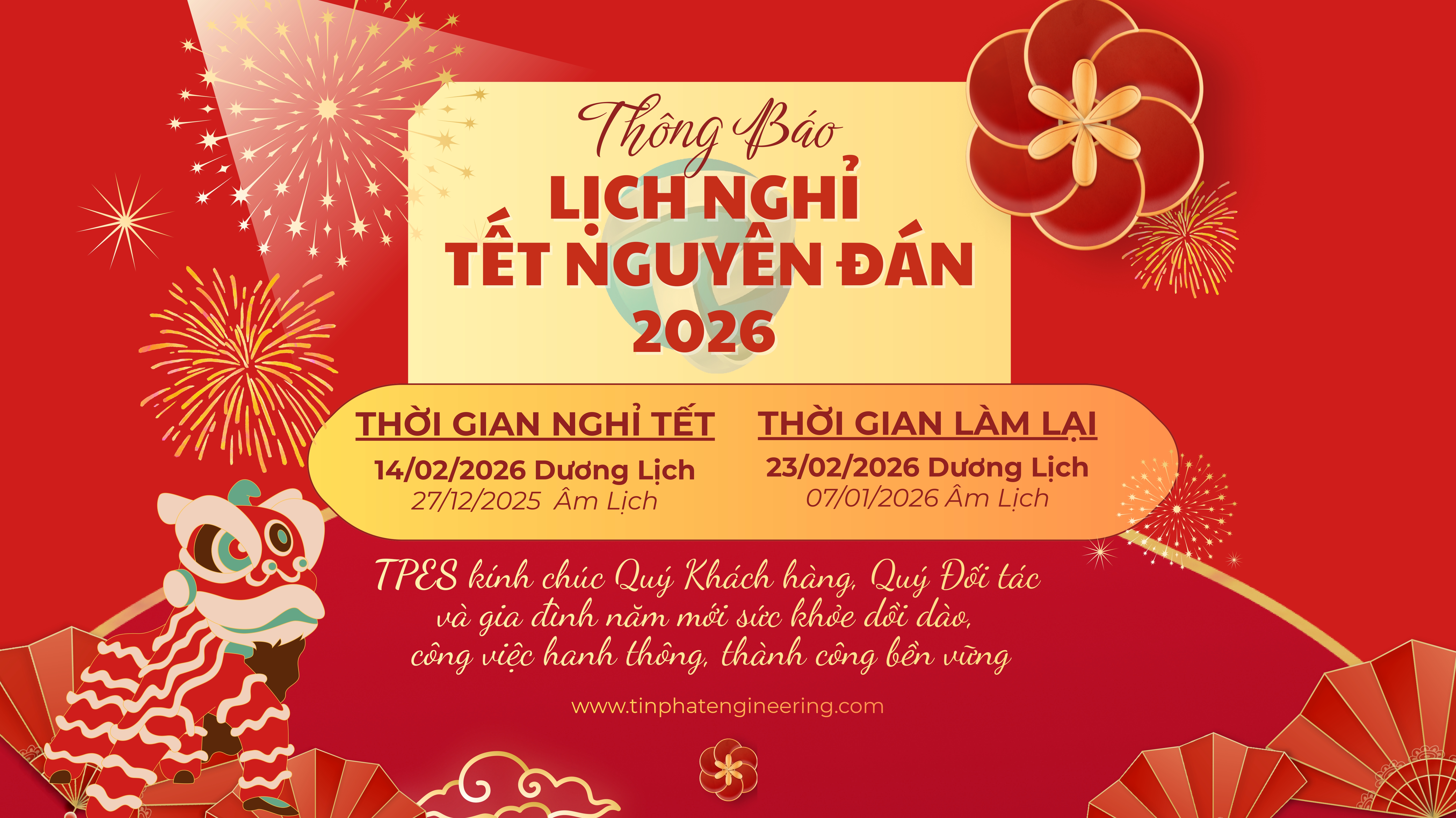 Công ty Cổ phần Giải pháp Kỹ thuật Tín Phát (TPES) xin trân trọng thông báo lịch nghỉ Tết Nguyên Đán 2026 như sau: